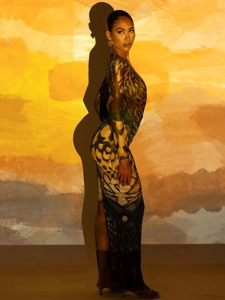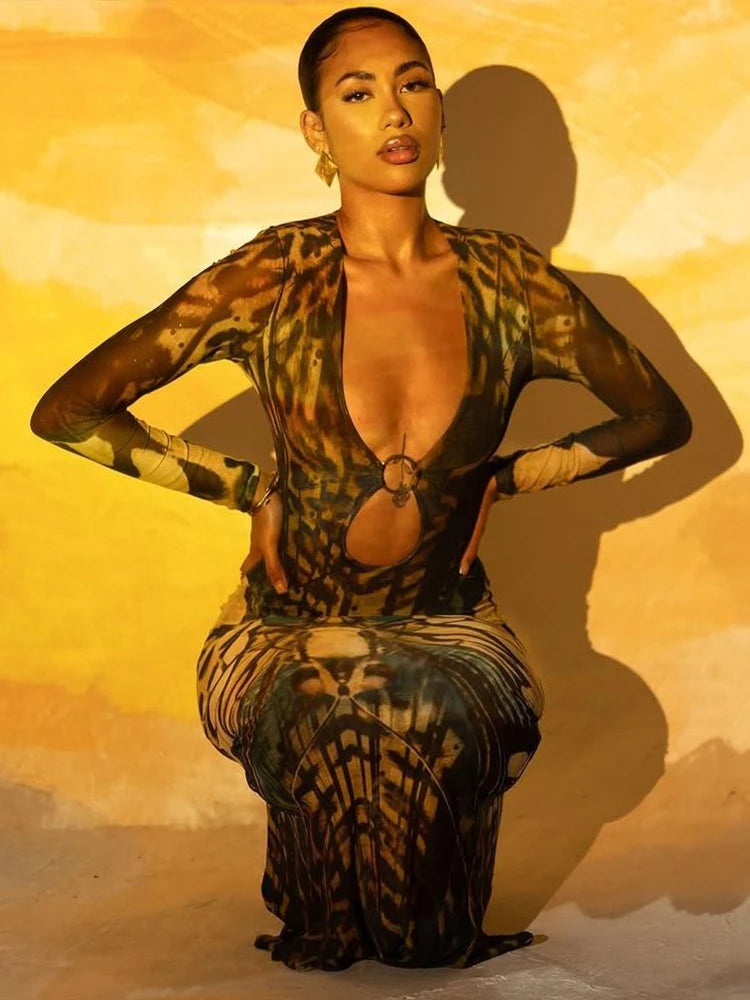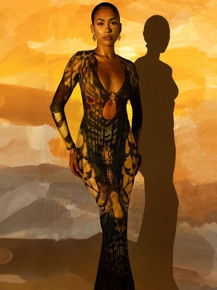Butterfly Print Metal Ring Hollow Low-Neck Dress