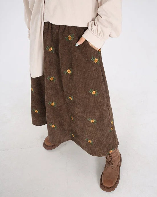Women's Skirt 2024 Spring Autumn Fashion Embroidered Floral Pocket Design High Waist Casual Versatile Loose Daily Long Skirt