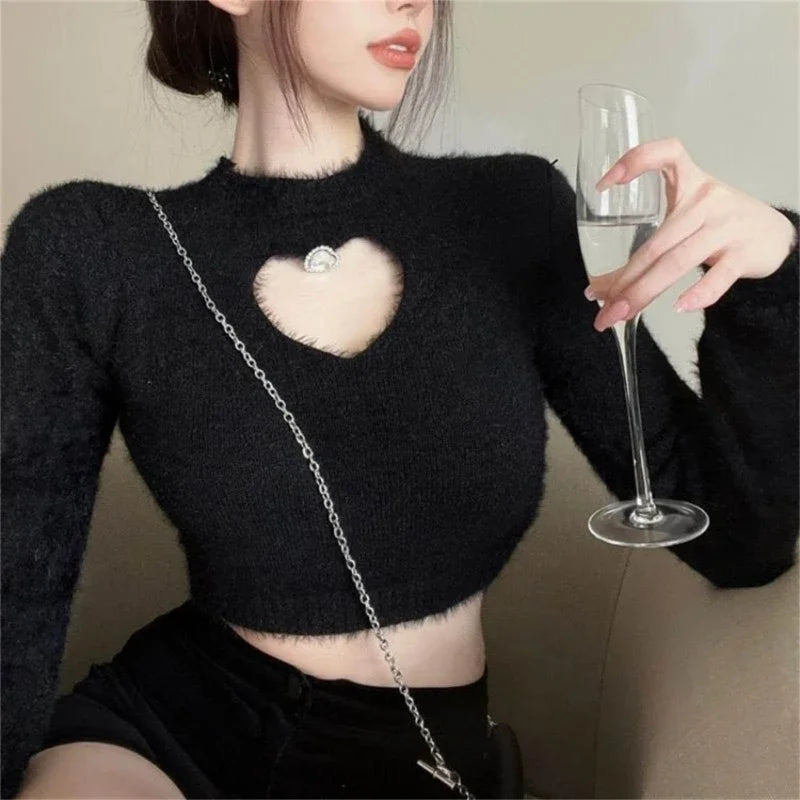 Features,long sleeve cropped sweater neck knit jumper,hollow heart knit tops fitted,fuzzy knitted fabric