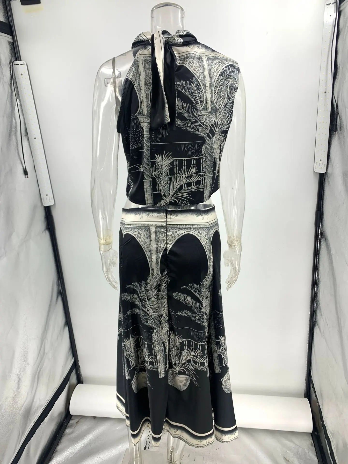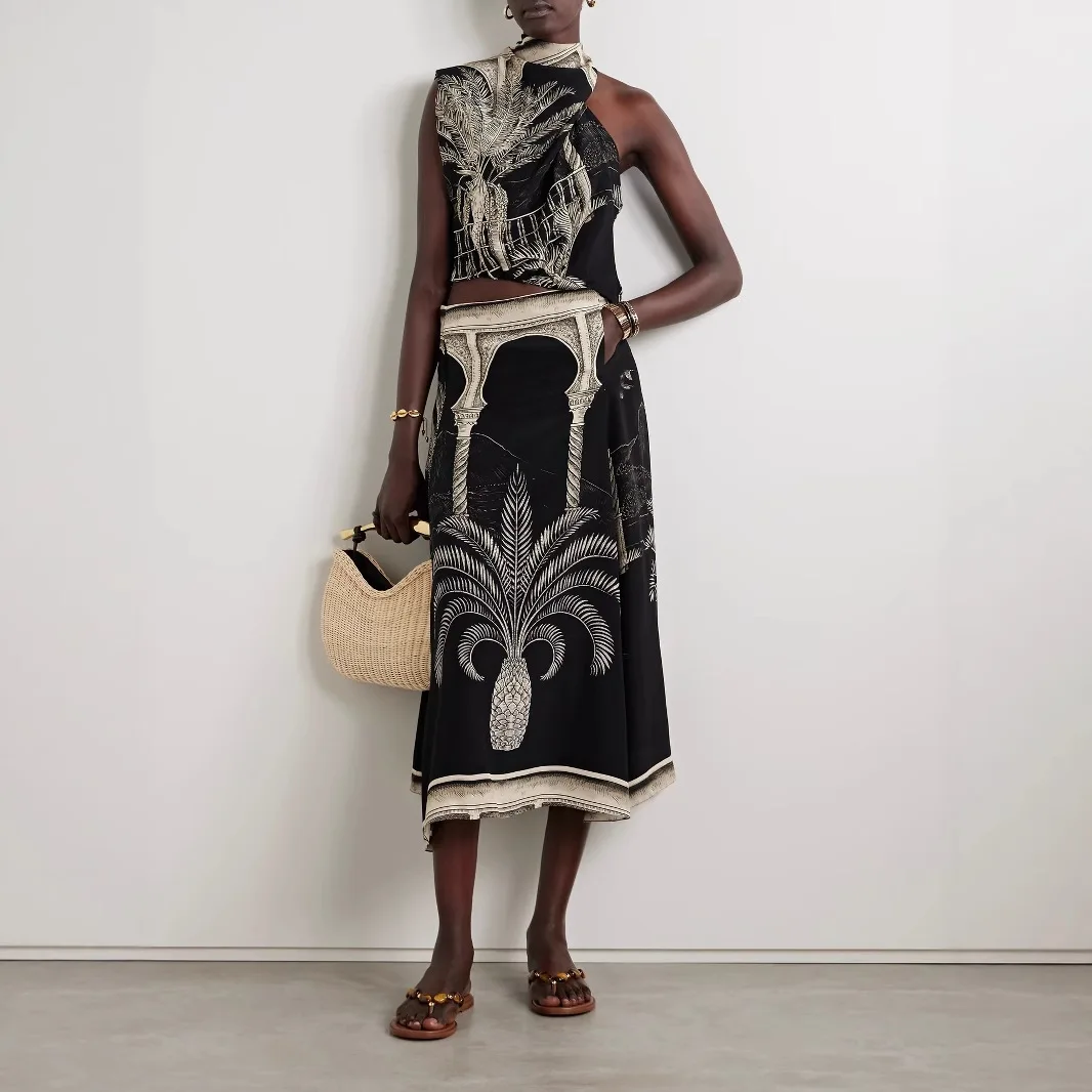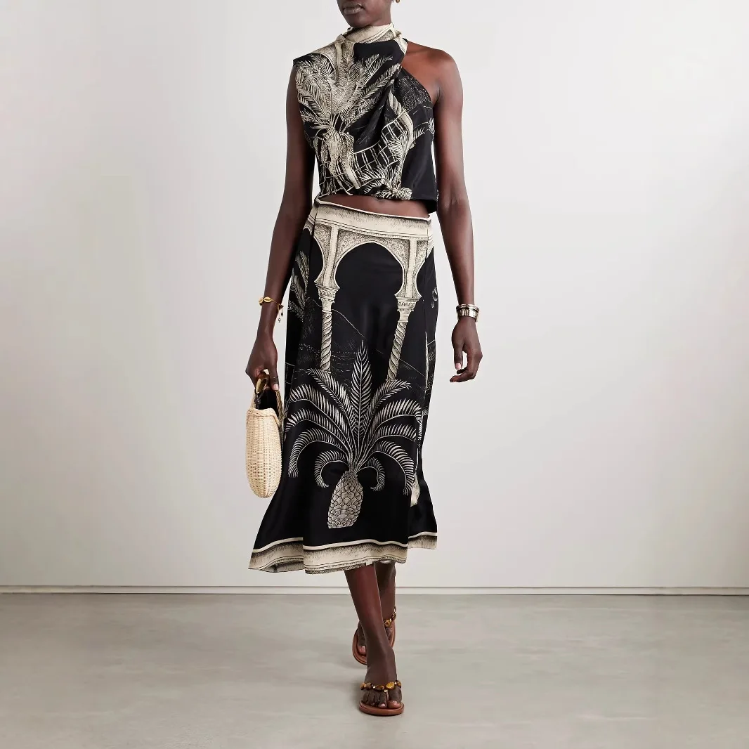 Vintage Print Satin Skirt Two Piece Set